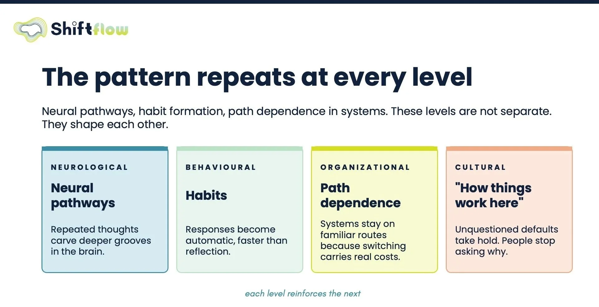 This maps directly onto what we know about neural pathways, habit formation, and what economists call path dependence: the tendency for systems to stay on familiar routes because switching carries real costs. The pattern repeats at every level: neurological, behavioural, organizational, and cultural. The AHA moment I had was realizing that these levels are not separate. They shape each other.