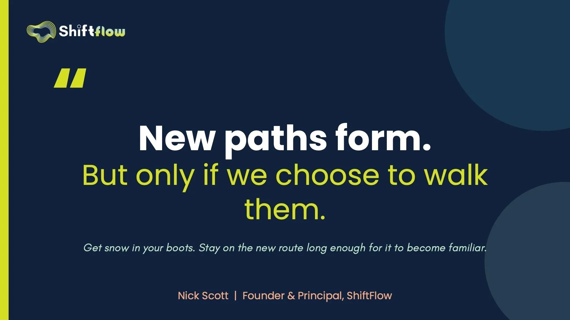 The implication for organizational change is significant. If you want to shift culture, you have to create conditions where new paths get travelled repeatedly. Not just announced, not just documented, but actually walked. And recognize that walking new paths will require more effort, more time, and more preparation than the usual route.