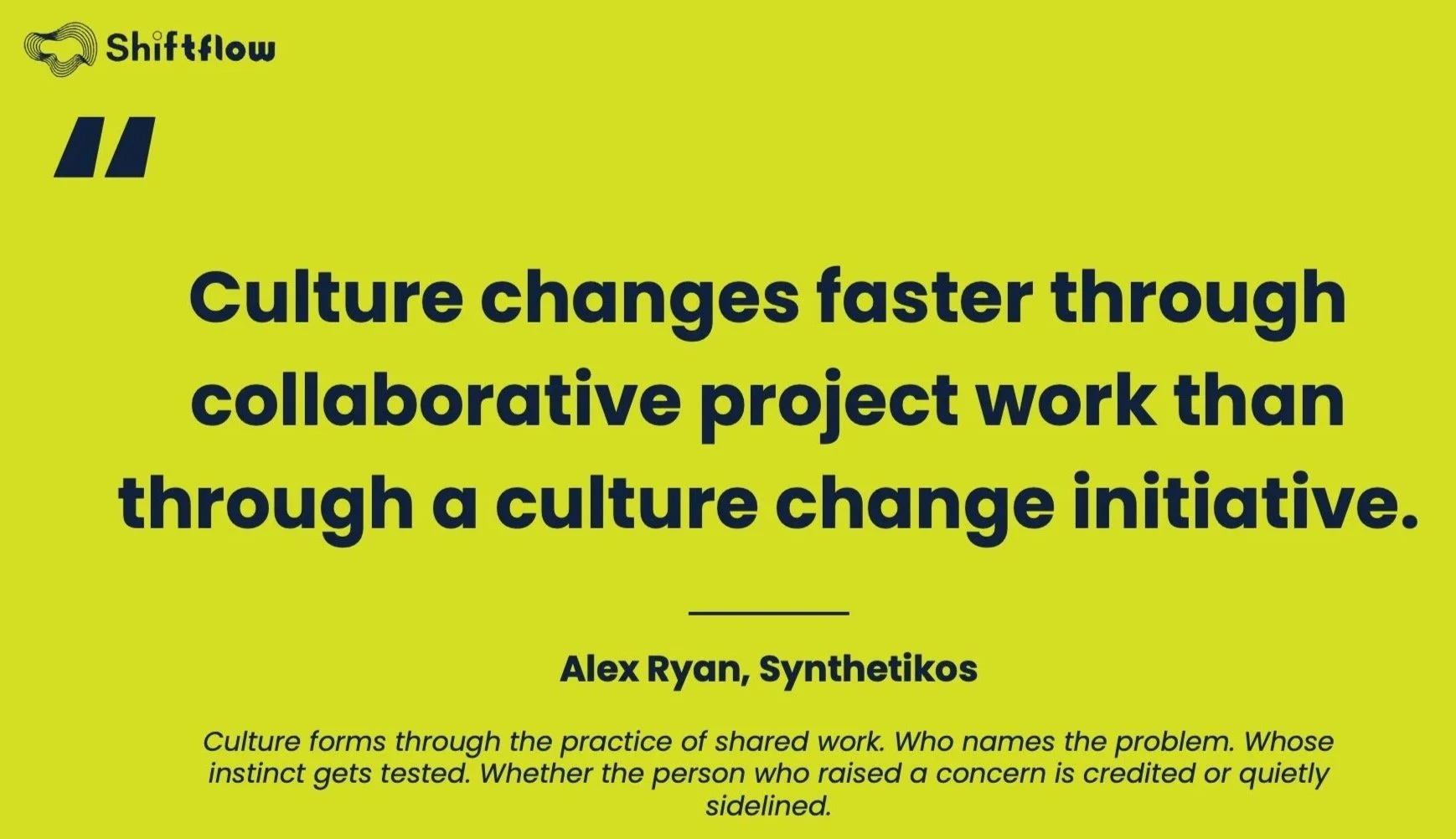 He means that culture forms through the practice of shared work: who gets to name the problem, whose instinct gets tested, whether the person who raised a concern at the start is credited or quietly sidelined at the end. Workshops about psychological safety do less than creating a real project where people experience what it feels like to speak up and be heard. A values statement does less than a senior leader visibly changing how they respond to failure. The path forms through use, not intention.