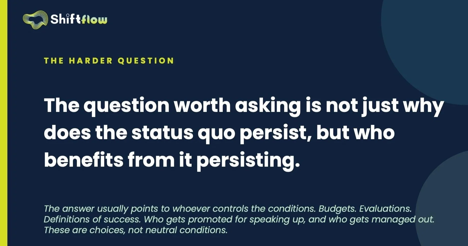Conversely, people do not stay on familiar paths only because ‘the snow is packed.’ They stay because leaving the path can cost them something. Approval. Opportunity. Safety. The question worth asking is not just why does the status quo persist but who benefits from it persisting. The answer usually points to whoever controls the conditions that make the old path feel like the rational choice. They control the budgets, the evaluations, the definitions of success, the post-incident reviews that decide whose judgment was sound and whose was reckless; who gets promoted for speaking up, and who gets managed out; whose judgment is trusted after a failure, and whose is not. These are not neutral conditions. They are choices, often made deliberately, that make certain paths feel safe and others feel career-limiting. Cognitive inertia is real, but it does not operate in a vacuum. It is reinforced by systems that reward compliance with the existing route.