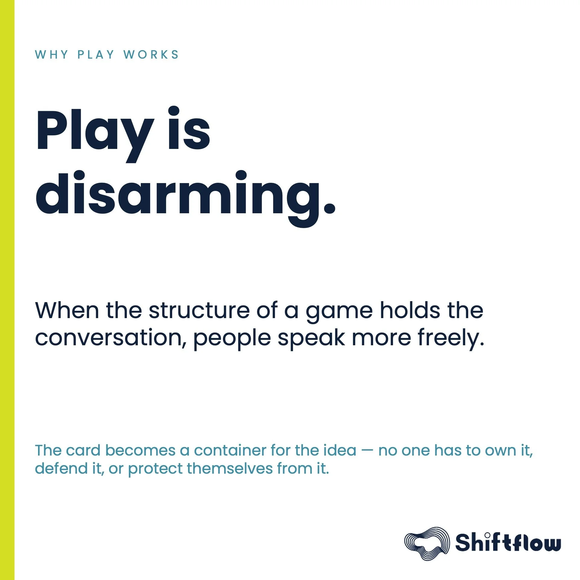 Play is disarming. When the structure of a game holds the conversation, people speak more freely. The card becomes a container for the idea — no one has to own it, defend it, or protect themselves from it. That's not a small thing inside bureaucratic systems where candour carries risk.