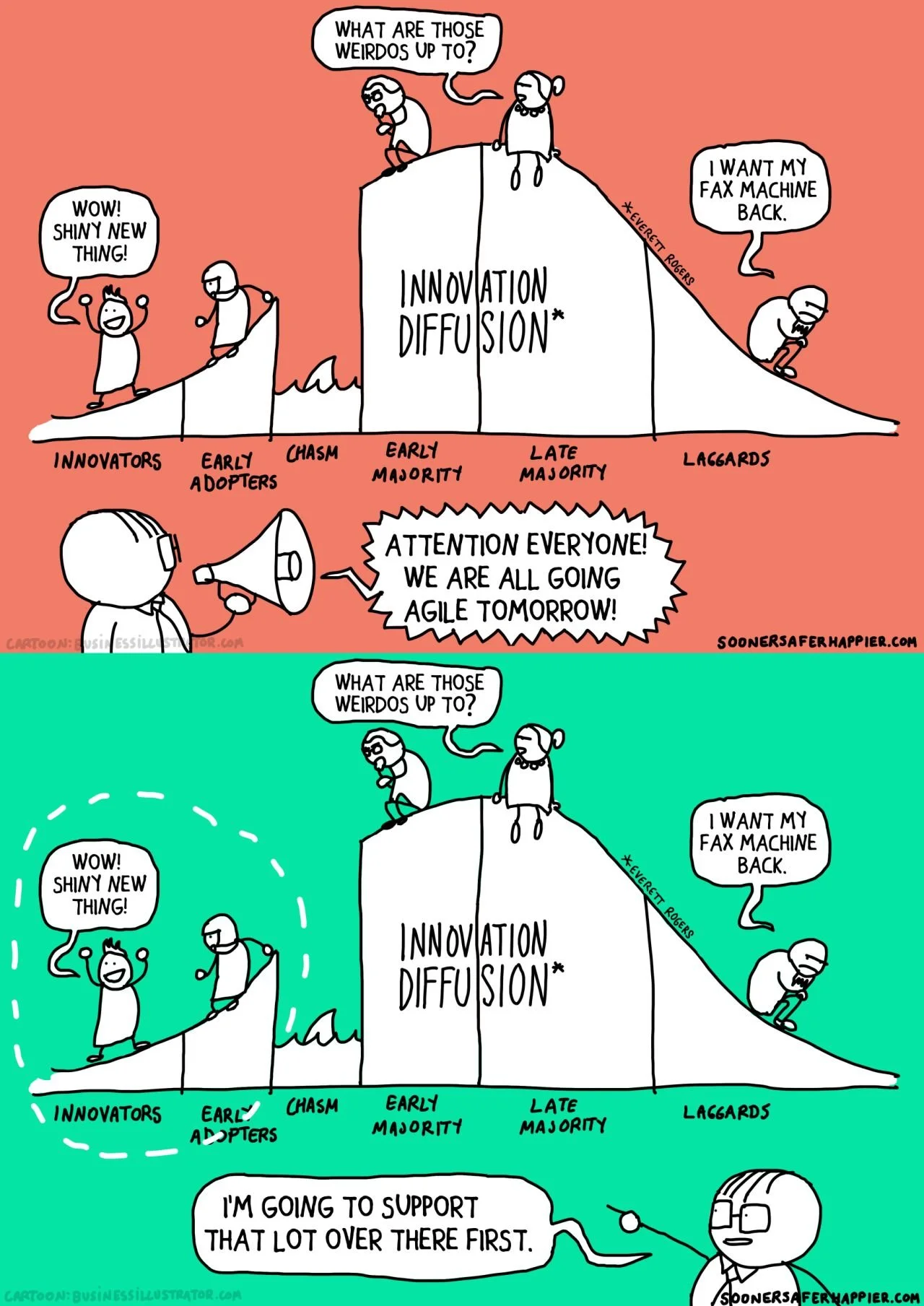 Coupled with other models of organizational maturity, the Dr. Everett Rogers’ Innovation Adoption Curve provides us with a lens on organizational change that can help us greatly accelerate the adoption of innovation practice in our organizations. How meta!